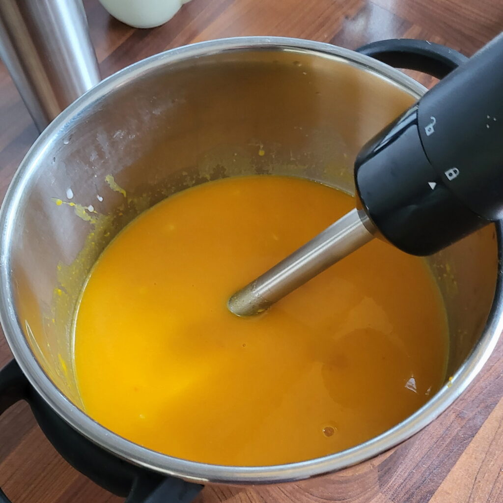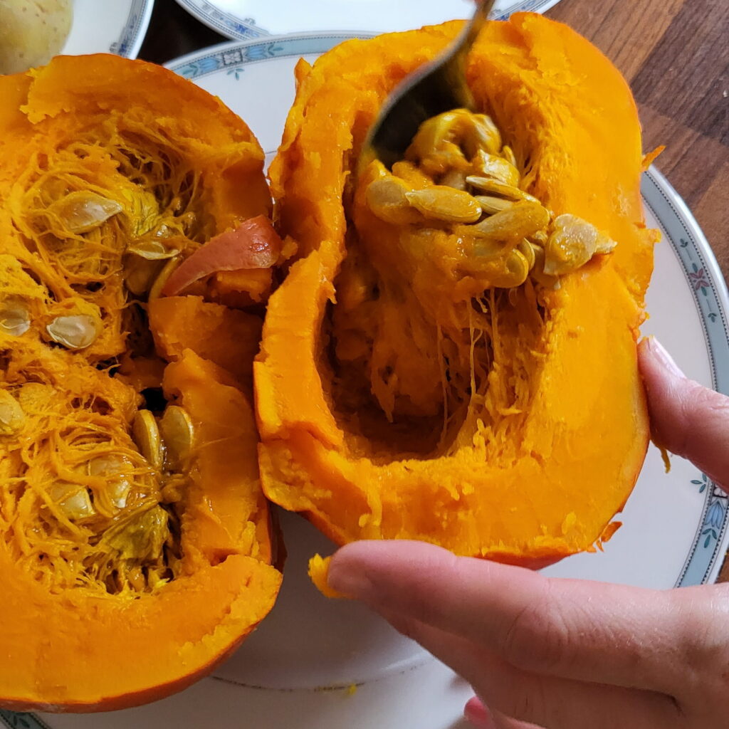 Zunächst den Kürbis und bei paar Kartoffeln einfach mit Salz im Dampfkochtopf weichkochen (so wie nur Dampfkartoffeln). Dann den Kürbis aufschneiden und den inneren Teil mit dem fasrigen Fleisch und den Kürbiskernen entfernen. Den Rest in kleine Stücke schneiden. Dazu die geschälten Kartoffeln geben und mit einem Pürierstab alles schön verrühren. Dann Chilli, Muskatnuss, Pfeffer und Kokosmilch und Wasser dazugeben und nochmal schön ziehen lassen. Schließlich kleingeschnittenen Ingwer als letztes hinzufügen.