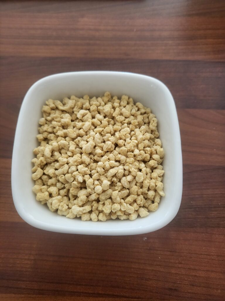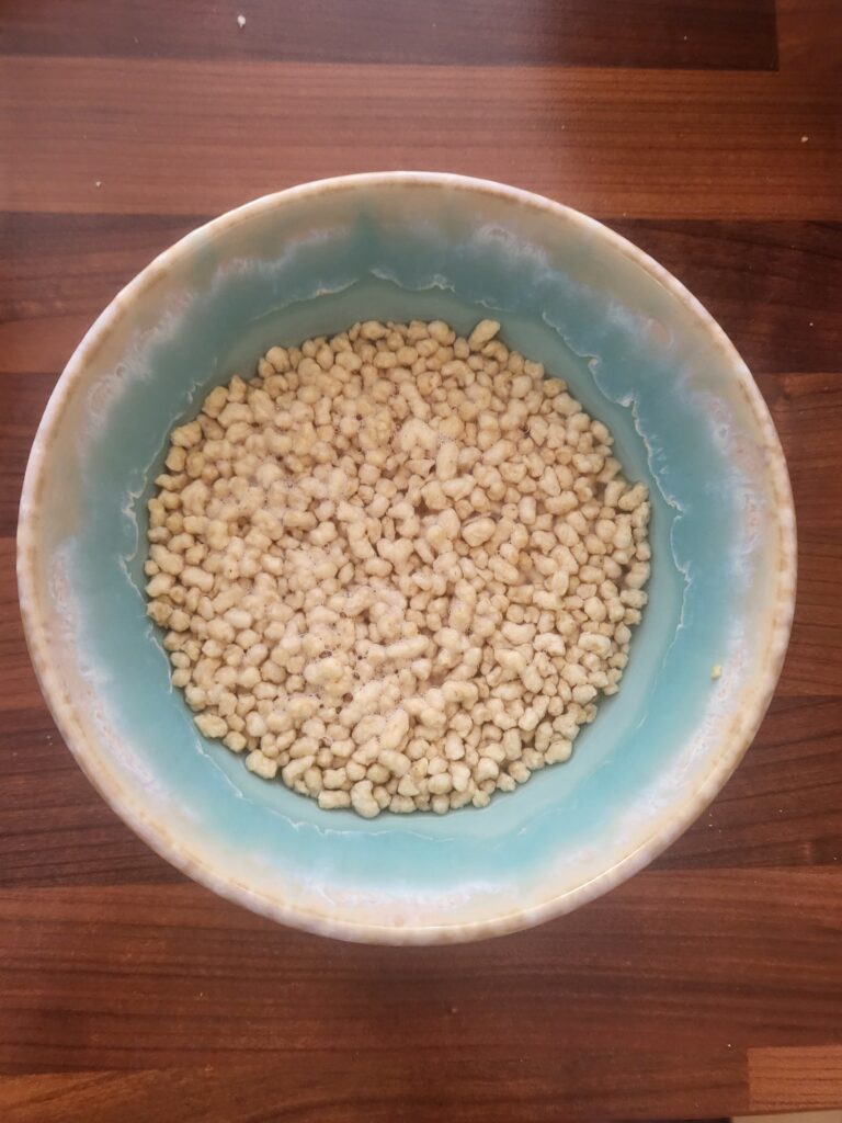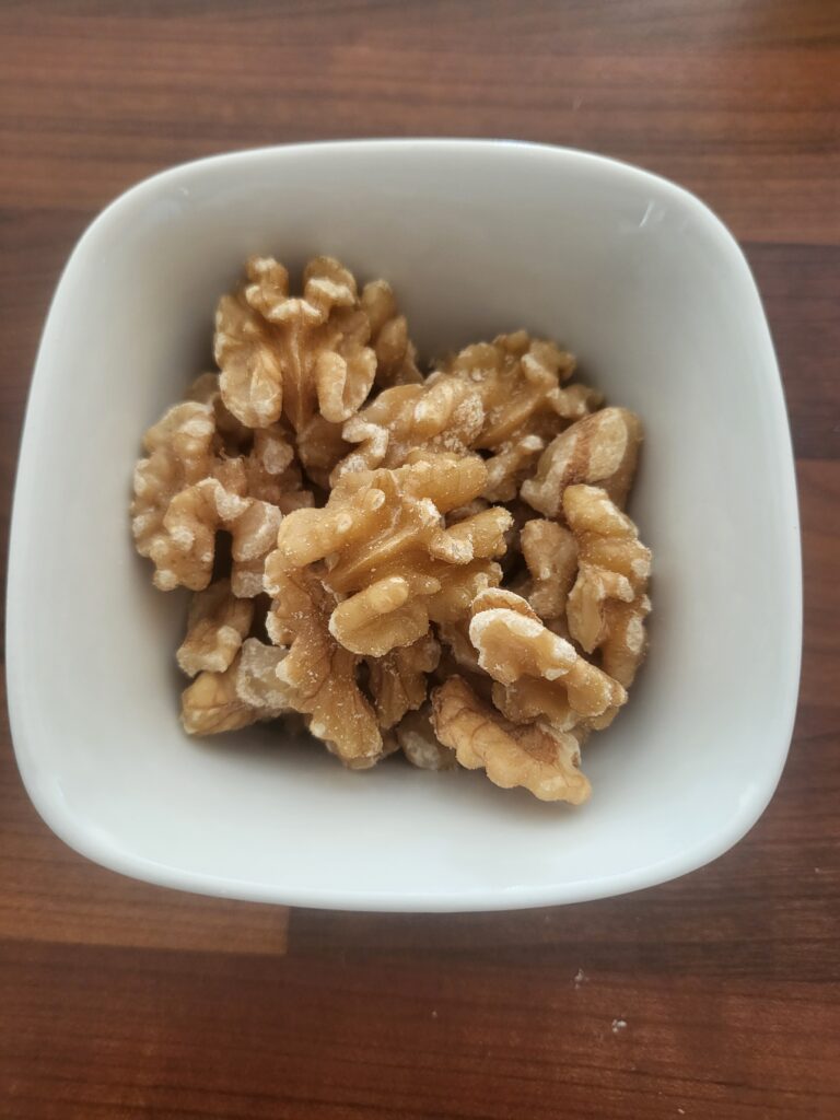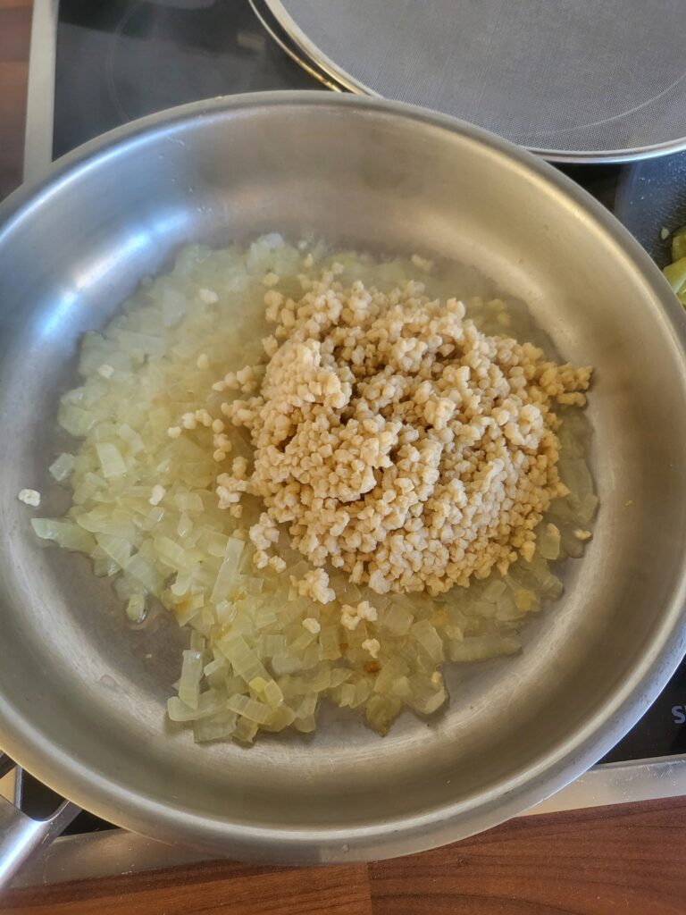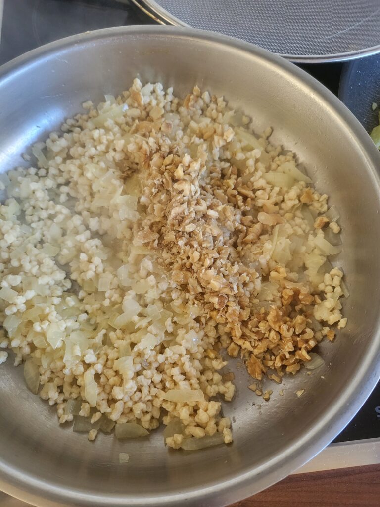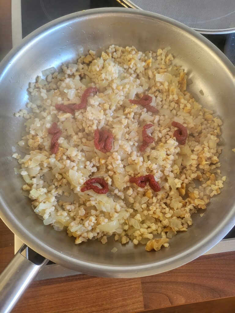 - Zwiebel und Knoblauch anbraten, Walnüsse und Sojagranulat zugeben und rösten.
