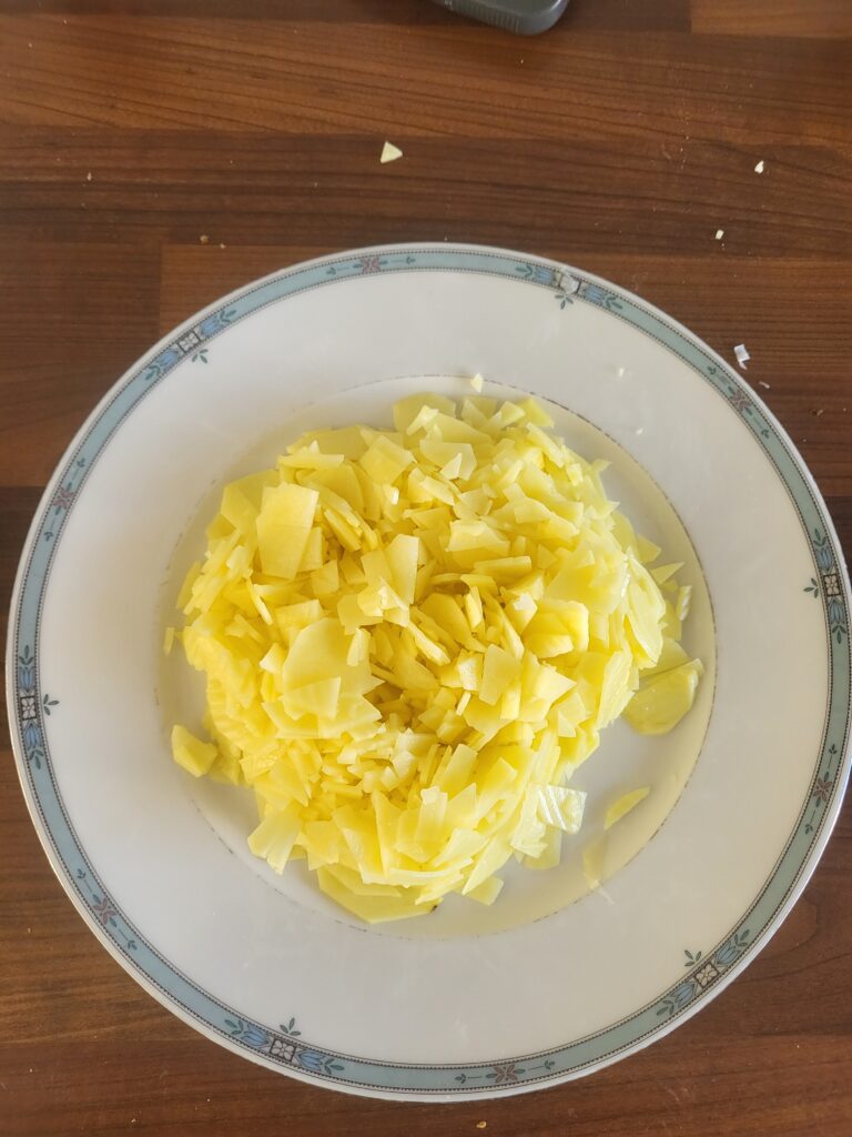 - Kartoffel grob reiben, gut ausdrücken und dünn als Rösti goldbraun anbraten.
