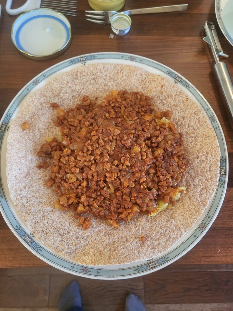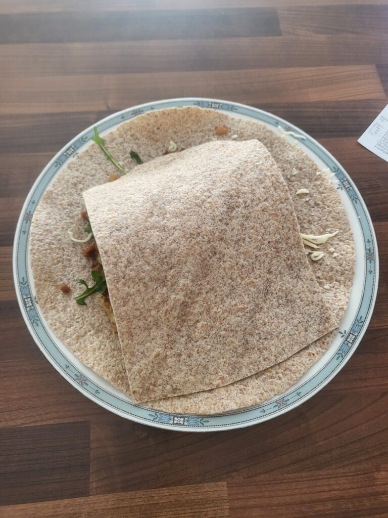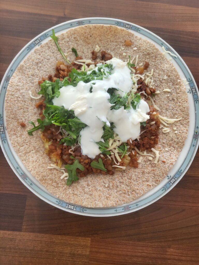 Bei mir sah es etwas anders aus, aber schmeckte super und macht extrem satt. Die angegeben Mengen reichen bei mir für zwei Wraps und ich schaffe maximal einen.