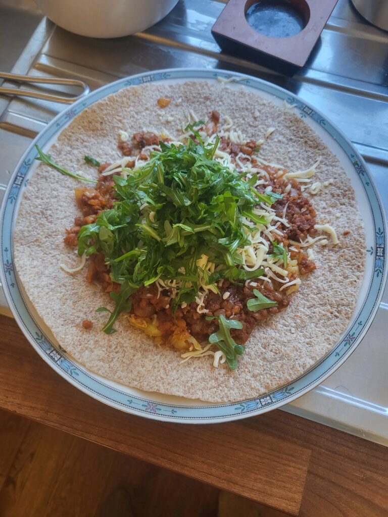 - Großen Wrap mit Käse und Hack belegen, Kartoffelpuffer darauflegen.